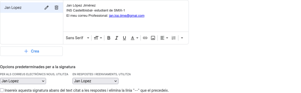 - Ajustos: He seleccionat la signatura creada per defecte tant per a correus nous com per a respostes i reenviaments.