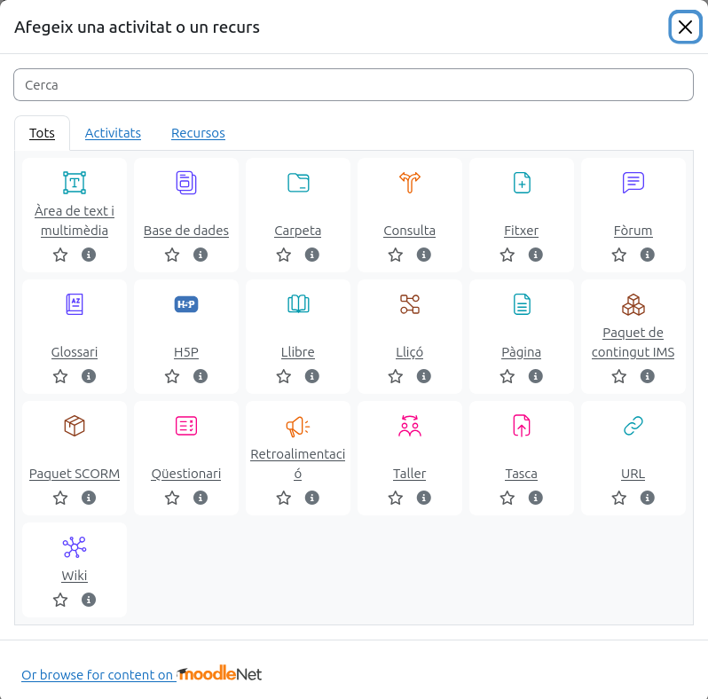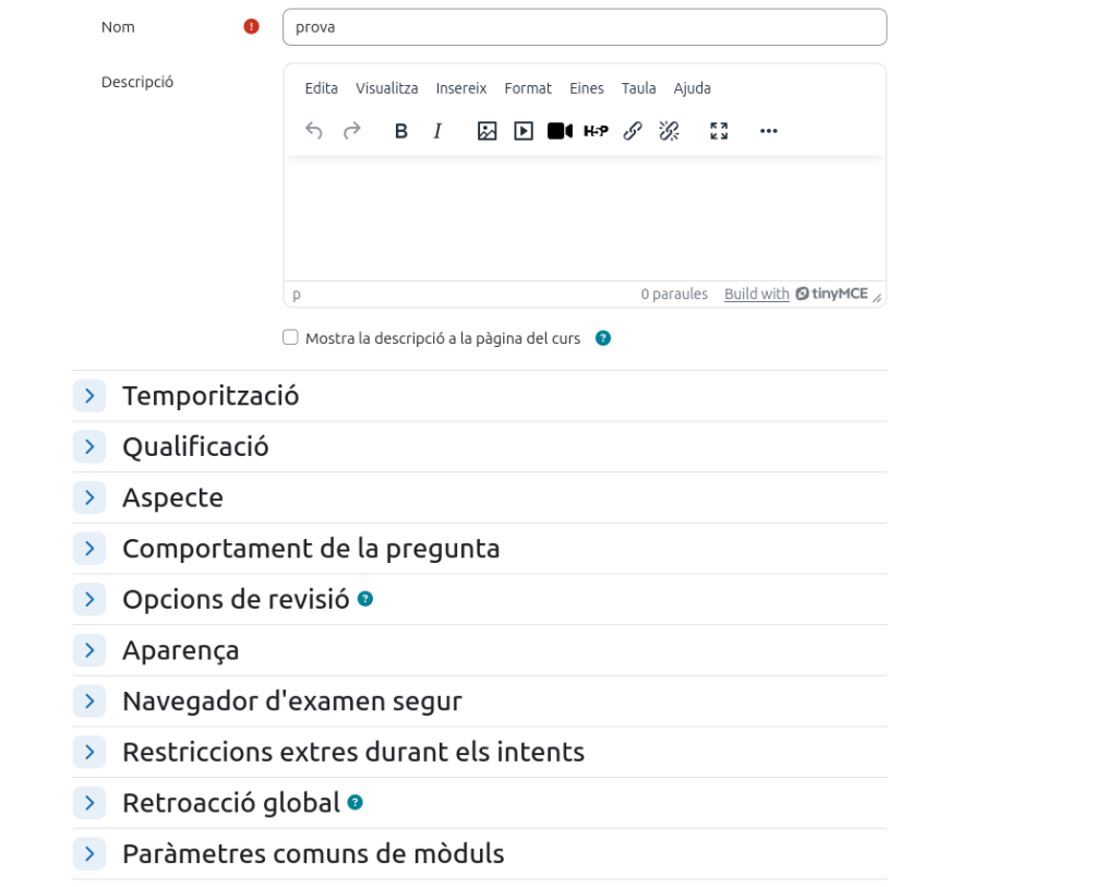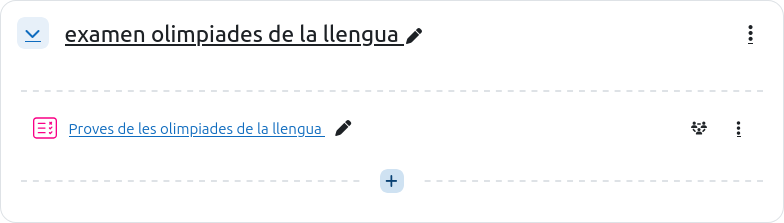Li canviarem el nom a l’apartat amb el nom de les proves i baix li donarem al símbol de + i li donarem a activitat o recurs.